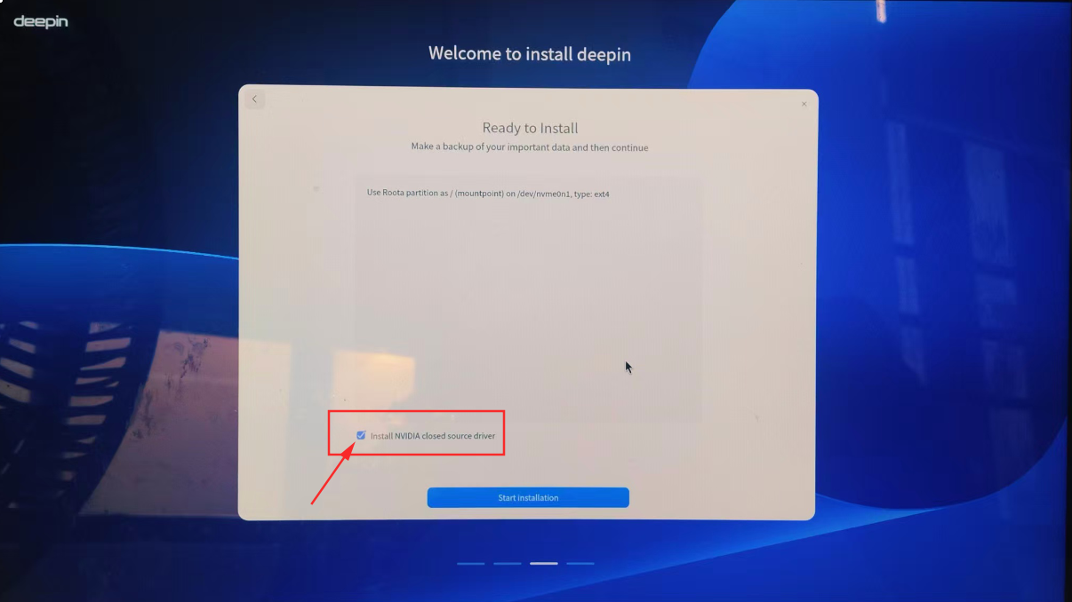 1. After selecting the installation type (Full Disk / Manual) and before confirming formatting, uncheck the option “Integrate NVIDIA proprietary driver”.