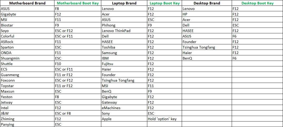 2. Restart your computer and press the appropriate key to enter the BIOS boot menu (common keys: Lenovo F12, HP F9, Dell ESC/F12, ASUS F8; for Intel‑based Mac, hold option).