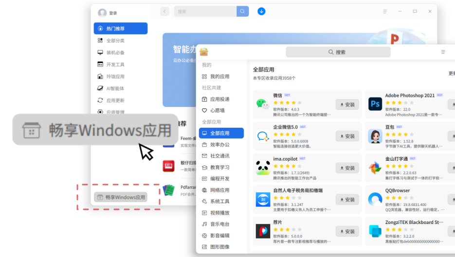 和统信 Windows 应用兼容引擎无缝衔接,跨生态装应用、用应用、管应用都更顺畅,打破系统壁垒,覆盖更多使用场景,你日常需要的 Windows 应用,现在都能更好地满足。