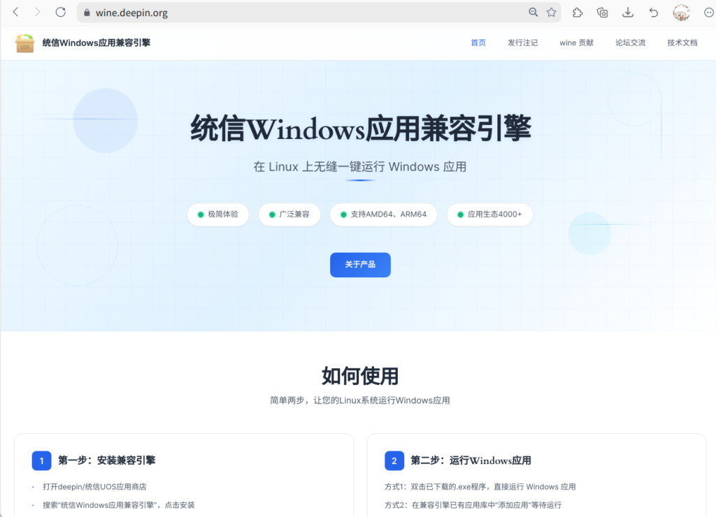 为了让大家更便捷地获取信息、下载工具、参与社区,统信 Windows 应用兼容引擎官方网站已全面重构,在这里,你可以了解最新版本动态,查阅常见问题与解决方案。