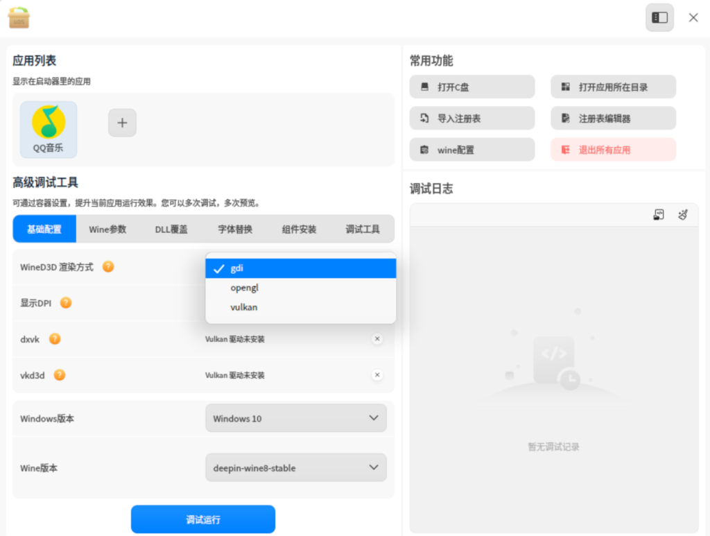 操作步骤:进入该应用的 高级调试 → 基础配置 → WineD3D 渲染方式,每次修改后点击“调试运行”测试效果