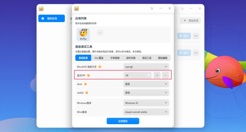 此时选择该应用的“高级调试 → 基础配置”,找到“显示 DPI 设置”,可以尝试修改到96。或者是需要调整界面缩放大小可以自行调整 DPI 值,调整后点击“调试运行”即可看到效果。