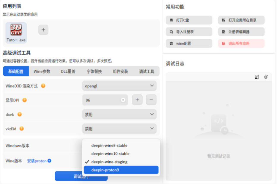 5. 安装完成后,回到高级调试界面,在 Wine 版本下拉框中就能看到新安装的 Proton 版本,选中它,然后点击“调试运行”。